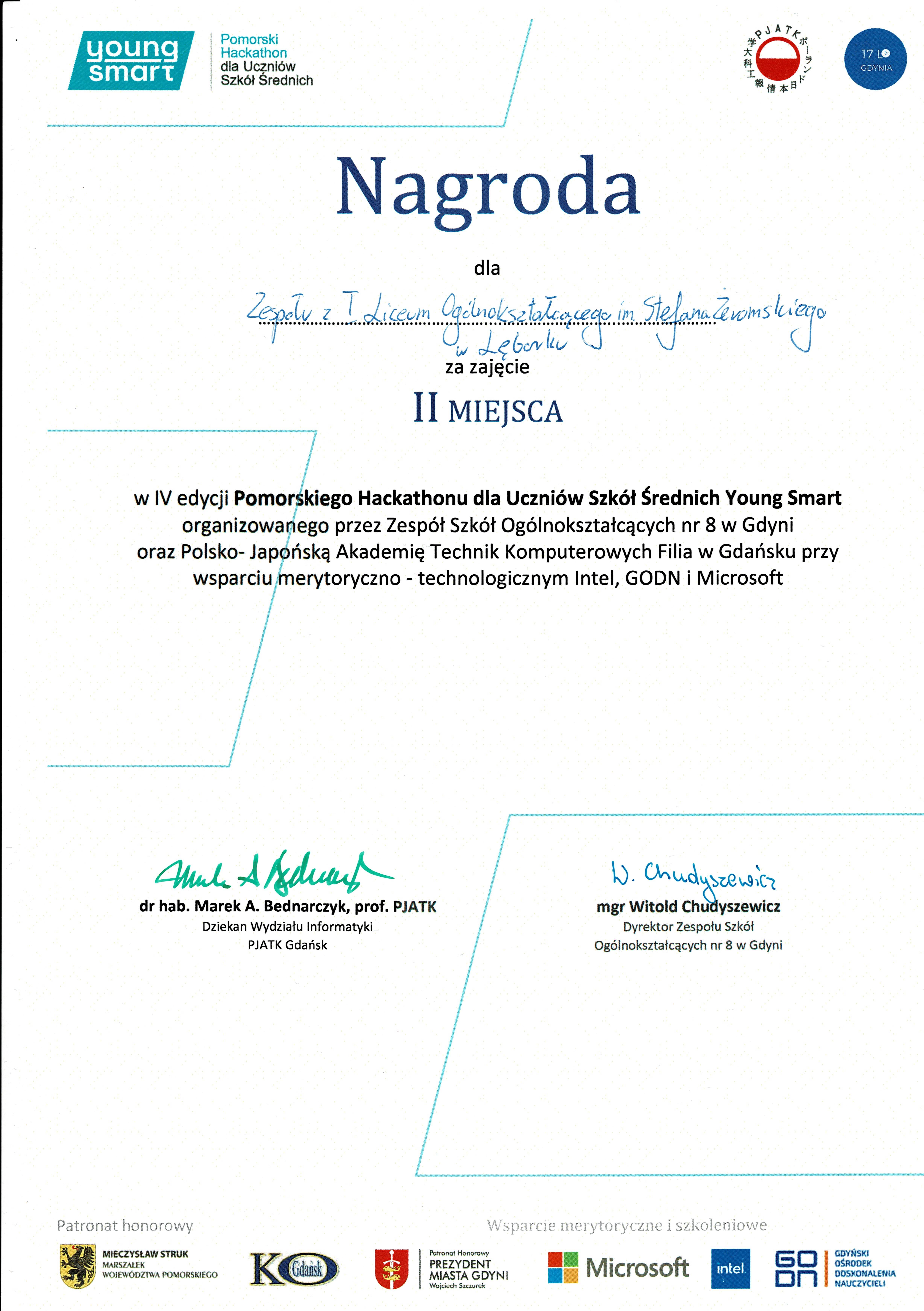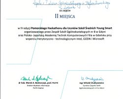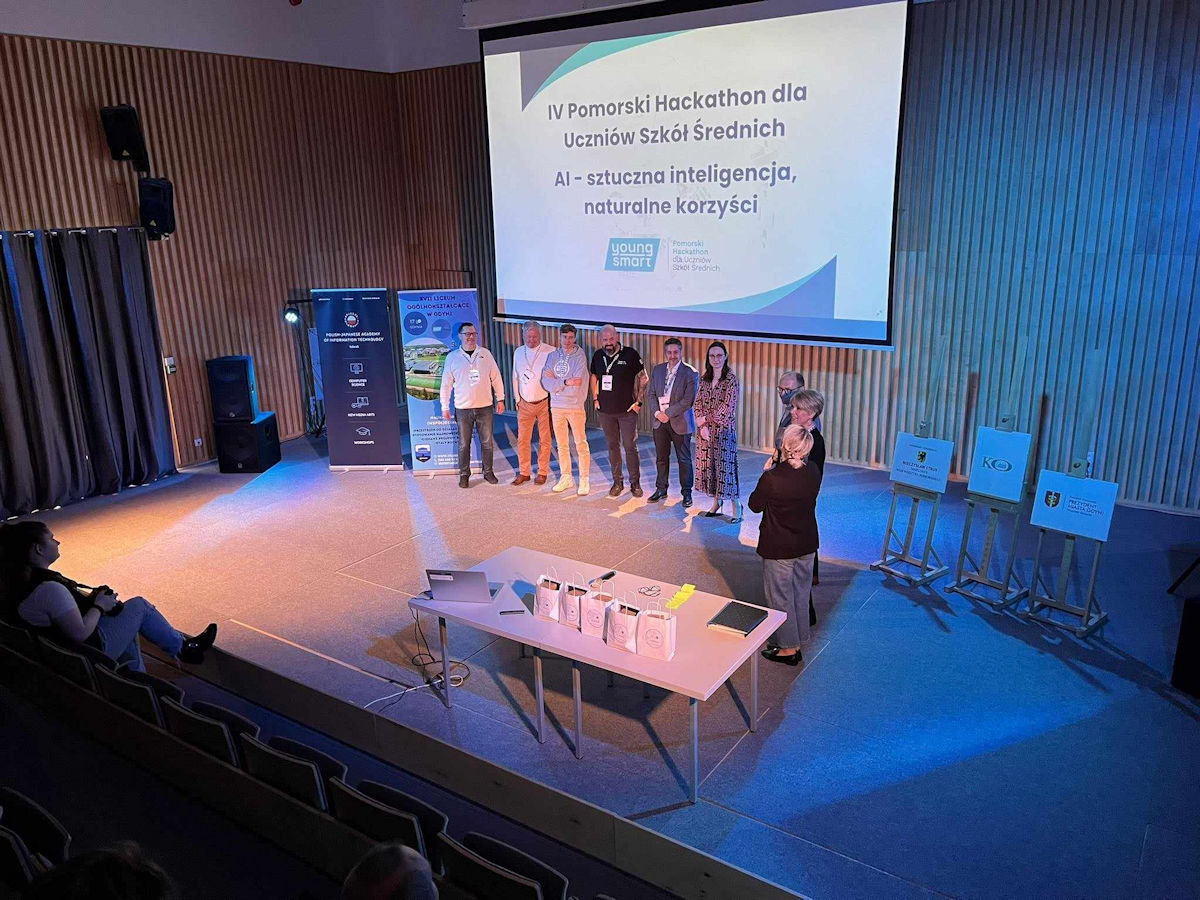 Miło nam poinformować, że nasi uczniowie w składzie: Rafał Żaczek, Mikołaj Maglewicz, Paweł Imielski, Dominika Rutkowska i Jakub Kowalczyk zajęli II miejsce w IV Pomorskim Hackathonie dla Uczniów Szkół Średnich "Young Smart" 2024 organizowanym przez 17 LO w Gdyni oraz Polsko-Japońską Akademię Technik Komputerowych w dniach 19-20 kwietnia.