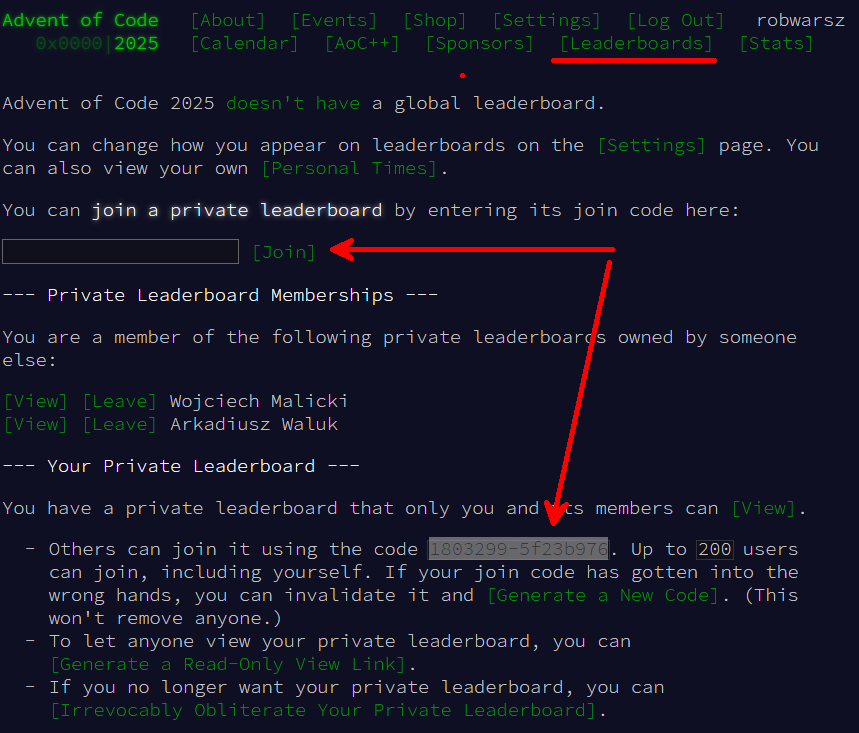 Aby dołączyć do wspólnej zabawy, wystarczy wejść na stronę adventofcode.com i wpisać nasz szkolny kod: