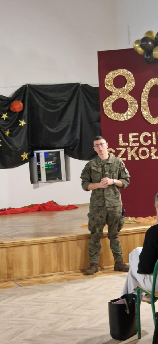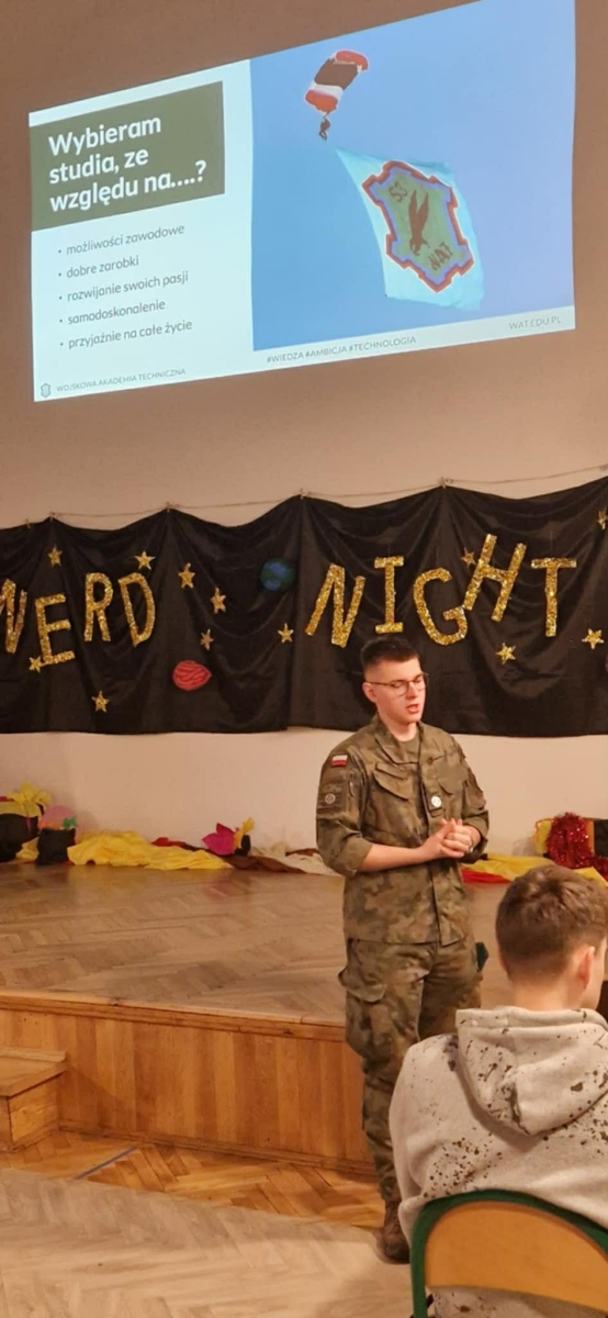 Student przedstawił naszym uczniom klas 3CM, 3A, 4CM i 4A sposób rekrutacji na uczelnię, wymagania oraz w ciekawy sposób opowiedział o wojskowym życiu studenta.
