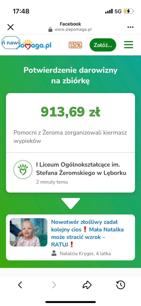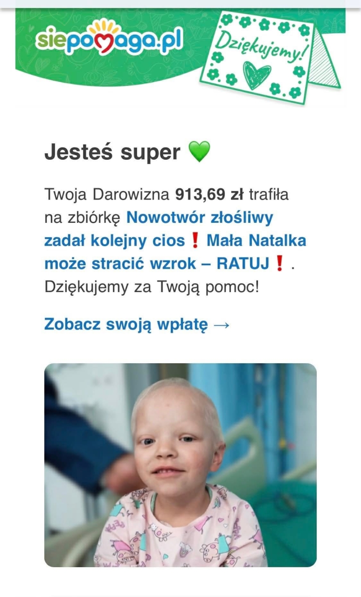 ❄️ Udało nam się zebrać rekordowe 913 zł i 69 gr, które zostaną przelane na zbiórkę dla walczącej z bardzo agresywnym glejakiem 4-letniej Natalki.