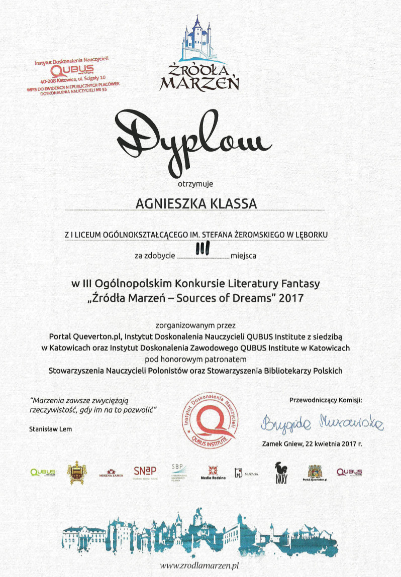 22.04.2017r. odbył się finał III Ogólnopolskiego Konkursu Literatury Fantasy „Źródła Marzeń”. O swoje marzenia powalczyła uczennica klasy IIb Agnieszka Klassa. Przebiegu finału towarzyszyła niezwykła atmosfera, odbył się on bowiem na pięknym zamku w Gniewie. Po napisaniu testu konkursowego finaliści mogli zwiedzać zamek i uczestniczyć w zajęciach szermierki, po których nastąpiło oficjalne ogłoszenie wyników. Nasza uczennica uzyskała wynik, który postawił ją na III miejscu w swojej kategorii – literatura J.R.R. Tolkiena. Laureatce gratulujemy i życzymy powodzenia w dalszym zdobywaniu marzeń.