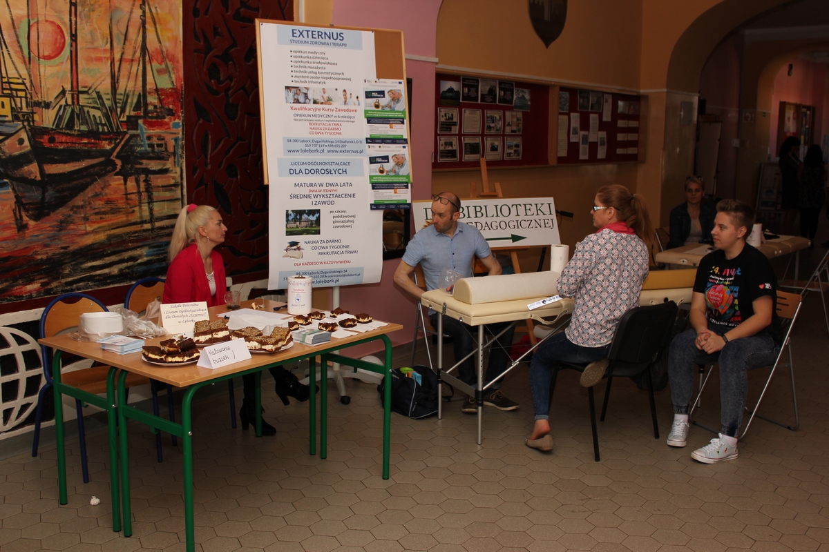 W auli szkoły została zaprezentowana oferta lęborskich placówek oświatowych dla gimnazjalistów na rok szkolny 2018/2019. Czas gościom umiliły występy uczniów z poszczególnych placówek, jak i pokaz Straży Pożarnej z Lęborka oraz możliwość przejechania się wozem policyjnym, który udostępniła Powiatowa Komenda Policji w Lęborku. Szczególne owacje zebrał zespół młodych akordeonistów ze Szkoły Muzycznej pod kierunkiem pana Marcina Wardulińskiego, jak również wspaniały chór oraz pokazy taneczne, wokalne i zespołowe, które dostarczyły nam wielu niezapomnianych wrażeń, Występy przeplatano licytacjami. Można było zakupić cenne gadżety ufundowane m. in. przez dyrektorów lęborskich szkół, np. dwugodzinne korepetycje z matematyki, Rozmówki polsko-włoskie, Artystyczne zdjęcie pt. „Zamyślona dziewczyna”, czy możliwość wejścia na wieżę I LO. Całość akcji poprowadził w profesjonalnym stylu pan Robert Palczewski, nauczyciel ZGŻiA ( "Rolniczak"), człowiek, który poświęcił organizacji Akcji dużo czasu i serca, który angażował Ludzi Dobrej Woli. W tym miejscu szczególne słowa podziękowania należą się: Kwiaciarni „Kamila” z Lęborka, Restauracji MacDonald z Lęborka, Herbaciarni „W Spichlerzu” ze Słupska, Sklepowi wędkarskiemu z Łeby, Cukierni K. Wenty z Bożegopola, Serwisowi samochodowemu Wachowiak, Restauracji „Różana”, Klubowi Siatkarskiemu Chemik Police, Pizzerni Toscana2 z Lęborka oraz Właścicielce Profesjonalnej Galerii Artystycznej, mieszczącej się przy ul. Zwycięstwa w Lęborku oraz wielu, wielu sponsorom, którzy ofiarowali na licytację to, co mogli. Dziękujemy za WIELKIE SERCE !