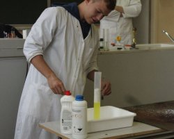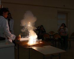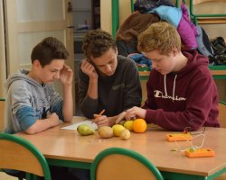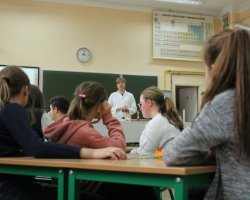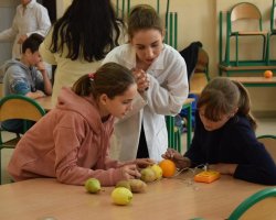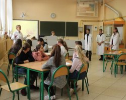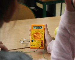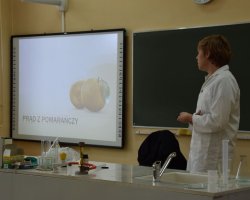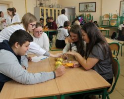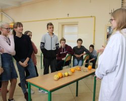 Po raz kolejny uczniowie klas biologiczno-chemicznych naszego liceum odkrywali tajemnice elektrochemii tym razem dla gości z Zespołu Szkół im. Strażaków Polskich w Nowej Wsi. Po krótkiej części teoretycznej i efektownych doświadczeniach wyjaśniających przebieg reakcji redoks uczniowie podzieleni na grupy mogli własnoręcznie wykonać ogniwa z owoców i warzyw. Grupa, której udało się zbudować układ w którym napięcie prądu było najwyższe dostała nagrodę.