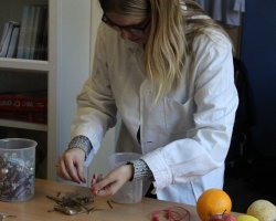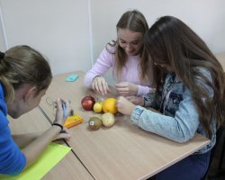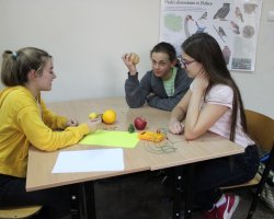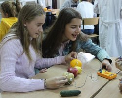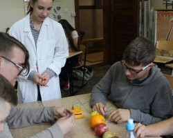Następnie uczniowie SGJ'u i SJSP'u mieli za zadanie zbudować ogniwo z warzyw i owoców. Tradycyjnie, grupa która zbudowała układ z najwyższym napięciem prądu otrzymała słodką nagrodę.