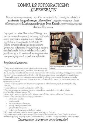 Serdecznie zapraszamy uczniów naszej szkoły do wzięcia udziału w konkursie fotograficznym „Sleeveface”, organizowanym z okazji zbliżającego się Międzynarodowego Dnia Książki, przypadającego na dzień 23 kwietnia.