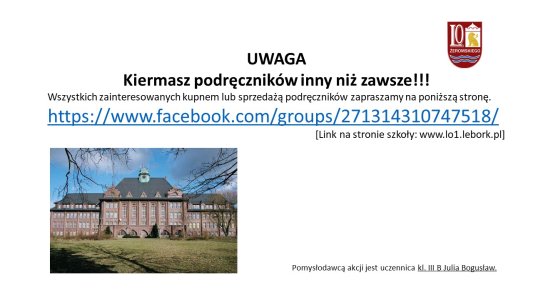 Kiermasz podręczników inny niż zawsze!!! Wszystkich zainteresowanych kupnem lub sprzedażą podręczników zapraszamy na poniższą stronę. https://www.facebook.com/groups/271314310747518
