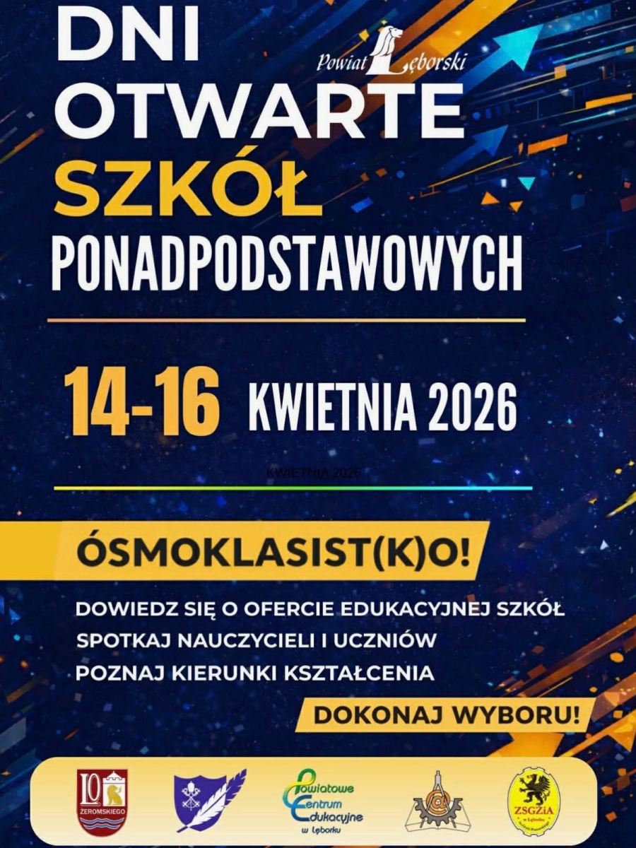 Szkoły ponadpodstawowe z terenu powiatu lęborskiego zapraszają uczniów klas VIII szkół podstawowych do udziału w Dniach Otwartych, które odbędą się w dniach 14–16 kwietnia 2026 r.