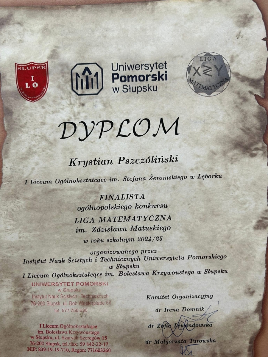 Miła informacja - nasz uczeń Krystian Pszczóliński z klasy 3CM został FINALISTĄ ogólnopolskiego konkursu LIGA MATEMATYCZNA 🧮