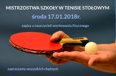 Zapraszamy wszystkich uczniów do udziału w Mistrzostwach Szkoły w Tenisie Stołowym dziewcząt i chłopców, które odbędą się w środę 17 stycznia 2018r.