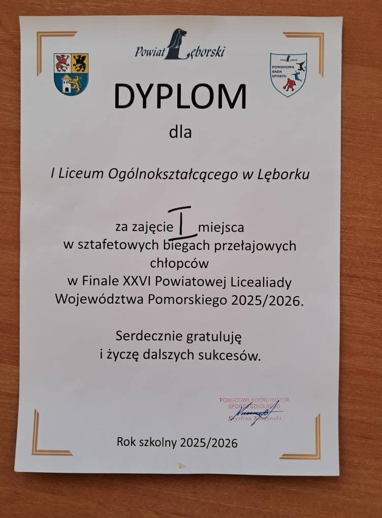 Reprezentacja chłopców I LO w Lęborku zdobyła I miejsce w sztafetowych biegach przełajowych w Finale XXVI Powiatowej Licealiady Województwa Pomorskiego 2025/2026! 💪🔥