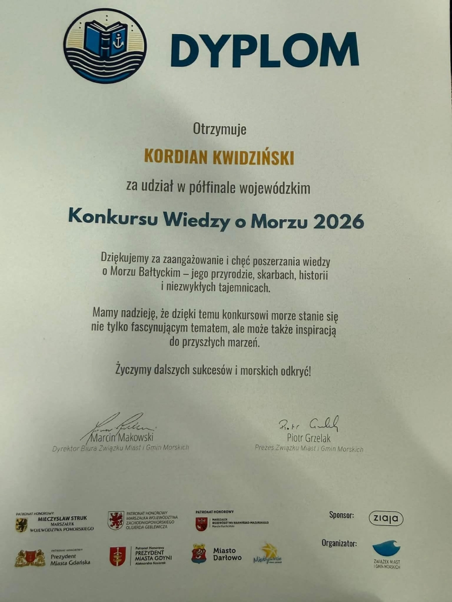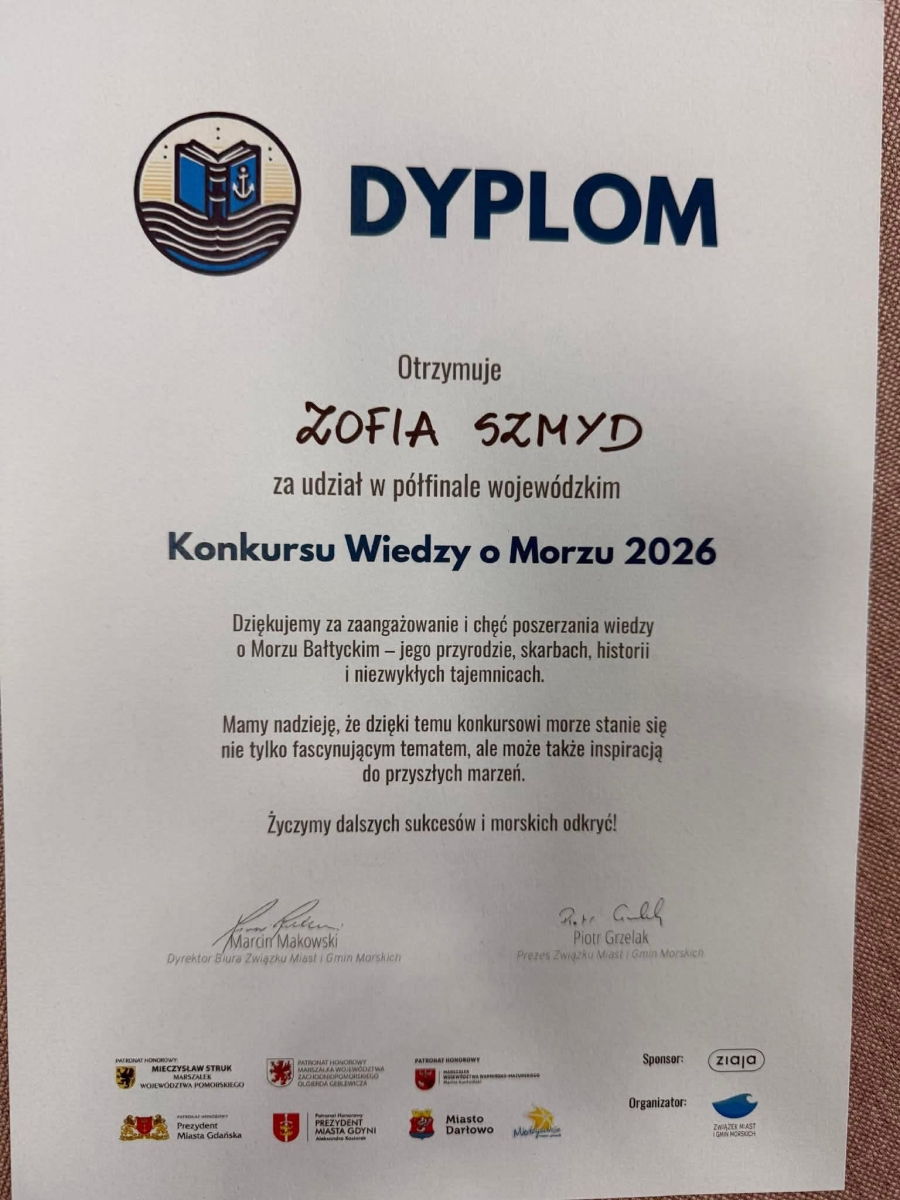 13.03.2026r. Zosia Szmyd i Kordian Kwidzinski z kl. 2A wzięli udział w półfinałach konkursu Wiedzy o Morzu 2026! Podium nie było, ale kolejne dobre doświadczenie za nimi! Dziękujemy Im za udział i godne reprezentowanie naszej szkoły!