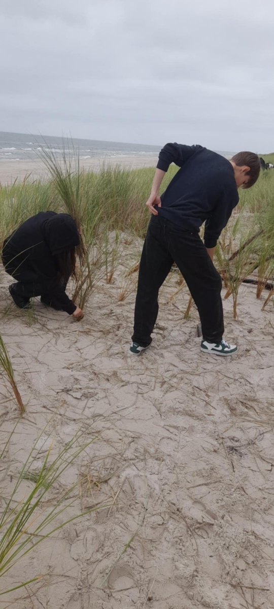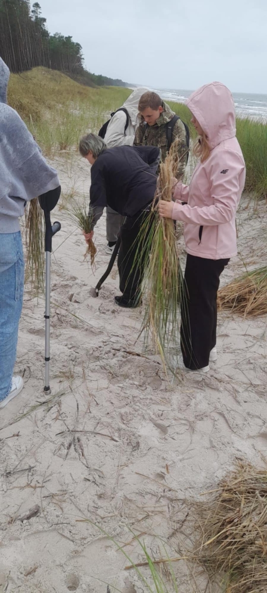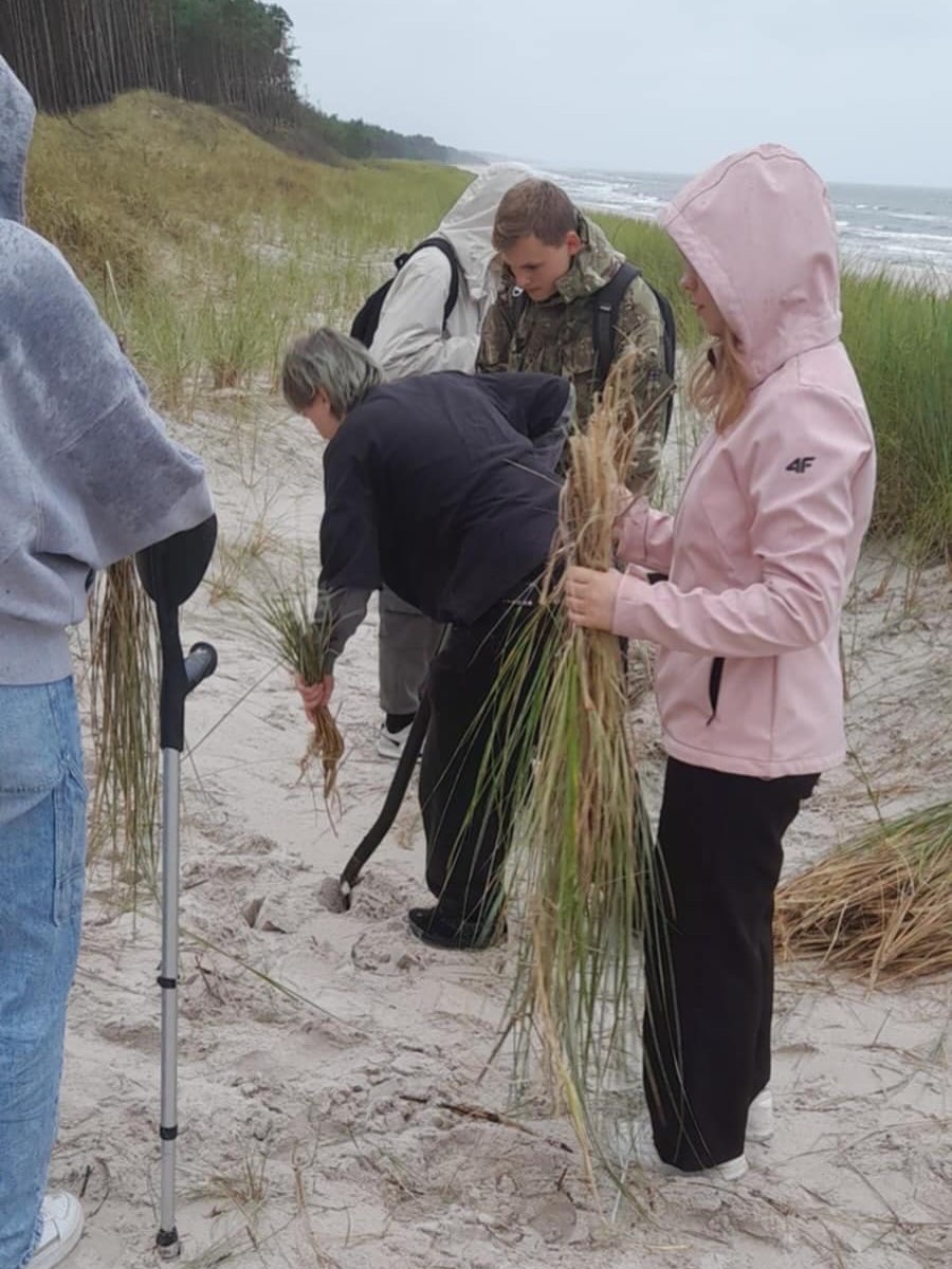 Projekt realizowany jest dzięki gościnności i wsparciu Urzędu Morskiego w Gdyni Obwód Ochrony Wybrzeża Lubiatowo. W ramach projektu uczestniczyliśmy w sadzeniu trawy wydmowej: piaskownicy zwyczajnej na wydmie białej w miejscowości Stilo. Przy wsparciu fachowców z Obwodu Ochrony Wybrzeża sądziliśmy piaskownicę zwyczajną, sprzątaliśmy plażę i wysłuchaliśmy ciekawych prelekcji na temat działań ochroniarskich na wydmach. Poczucie, że robimy coś dobrego dla przyrody dało nam ogromną satysfakcję. Dziękujemy kierownikowi obwodu Panu Wacławowi Lipcowi, zarządcy obwodu Panu Wojciechowi Labudzie i wszystkim pracownikom za gościnę, super atmosferę i wsparcie.