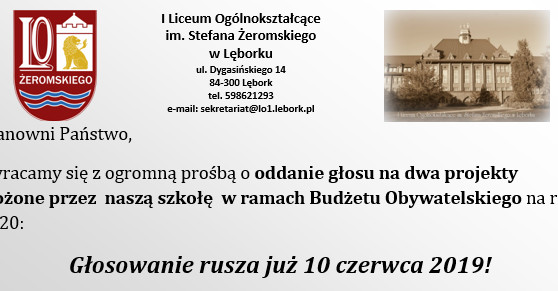 Zwracamy się z ogromną prośbą o oddanie głosu na dwa projekty złożone przez naszą szkołę w ramach Budżetu Obywatelskiego na rok 2020: